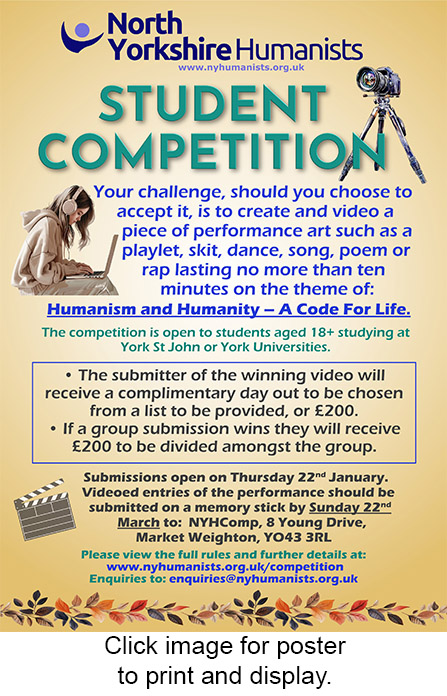 In addition, the winners will also be invited to promote their entries and join North Yorkshire Humanists in devising and delivering agreed outreach activities that promote awareness and understanding of humanism.
